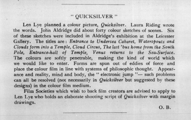 The substantial body of visual and sound material created for Quicksilver suggests that, far from being an obscure moment in Lye’s career, it was one of his more substantial undertakings. What currently sits dispersed in archives and collections between the United Kingdom, New Zealand, and Australia is a considerable counterpoint to the rather grim consolation prize Lye was to secure through the project, directing the special effects in Rowland's 1938 film Stardust (variously titled He Loved an Actress and Mad About Money).